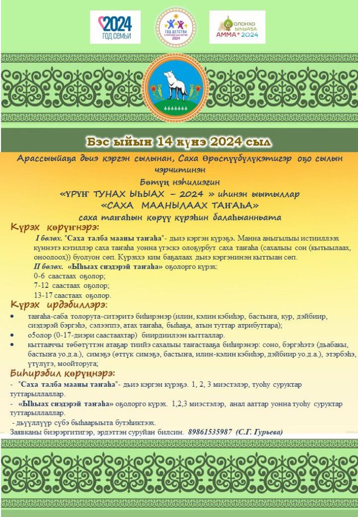 Күндү Бөтүҥмүт дьоно-сэргэтэ! Бэс ыйын 1️⃣4️⃣ күнүгэр күнүс 1️⃣4️⃣:0️⃣0️⃣ чаастан, «Дьаам алааһыгар»??? Амма улууһугар Бөтүҥ нэһилиэгэр олоҥхо сылын чэрчитинэн уонна «Оллоон» оҕо көрдөрүүлээх фольклорнай ансаамбылын иитиллээччитэ Маша Давыдова аатыгар анаммыт уһуйаан, оскуола оҕолорун иһинэн ыытыллар «Оллоон олоҥхото!» күөн күрэскэ кыттын диэн ыҥырабыт??? Күрэххэ кытталлар: Сайаапканы (толору ааккыт, сааскытын, толорор олоҥхоҕут аатын) ватсап нөҥүө 89679133439 (Попова […]